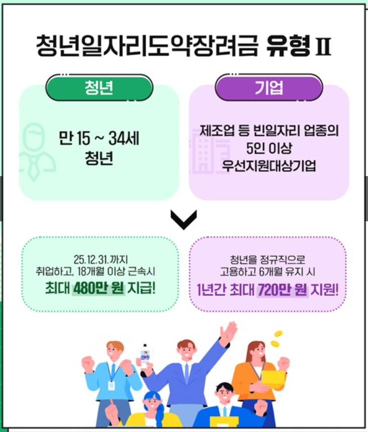 새롭게 신설된 유형Ⅱ은 제조업 등 빈일자리 업종의 5인 이상 우선지원대상기업이 만 15세부터 34세까지의 청년을 정규직으로 채용하고 6개월 이상 고용을 유지하면 기업은 1년간 최대 720만 원을 지원받을 수 있습니다.