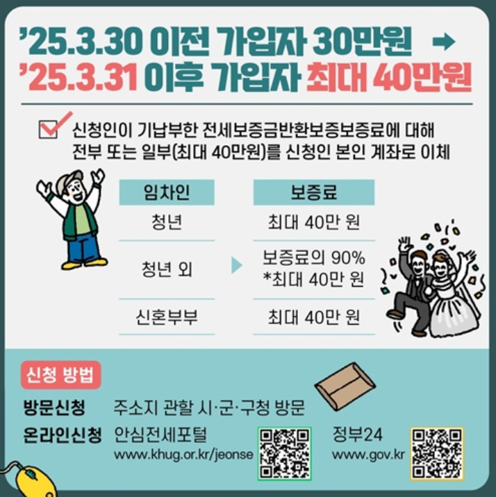 전세 사기를 예방하고 임차인의 권리를 보호하기 위해 정부는 전세보증금 반환보증 보증료에 대해 일정 금액을 지원하는 제도를 시행하고 있습니다. 2025년부터는 해당 지원금이 최대 40만 원으로 상향되며, 보다 많은 국민이 혜택을 받을 수 있도록 기준이 확대되었습니다.