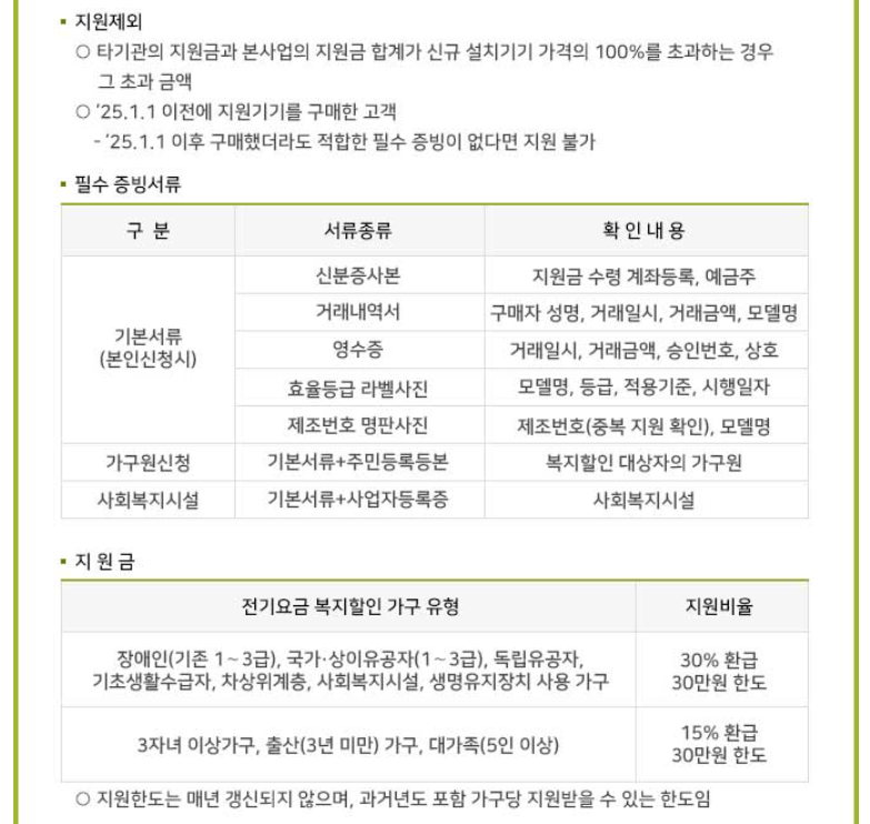 2025년 한전 고효율 가전제품 구매지원사업은 특정한 요건을 충족하는 대상자에게만 지원됩니다. 해당 사업의 주된 수혜층은 에너지 취약계층으로 분류되는 가구이며, 신청 자격을 갖춘 경우, 최대 30만 원 한도 내에서 가전제품 구매 비용의 일부를 환급받을 수 있습니다.