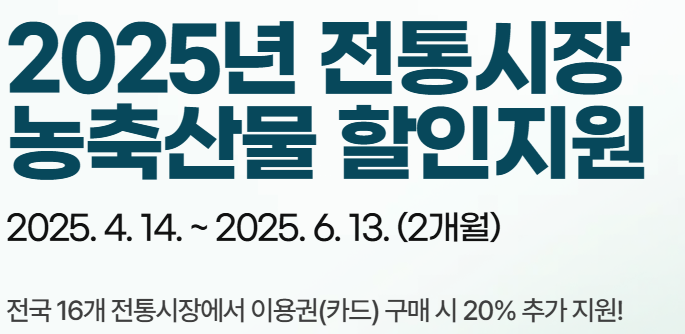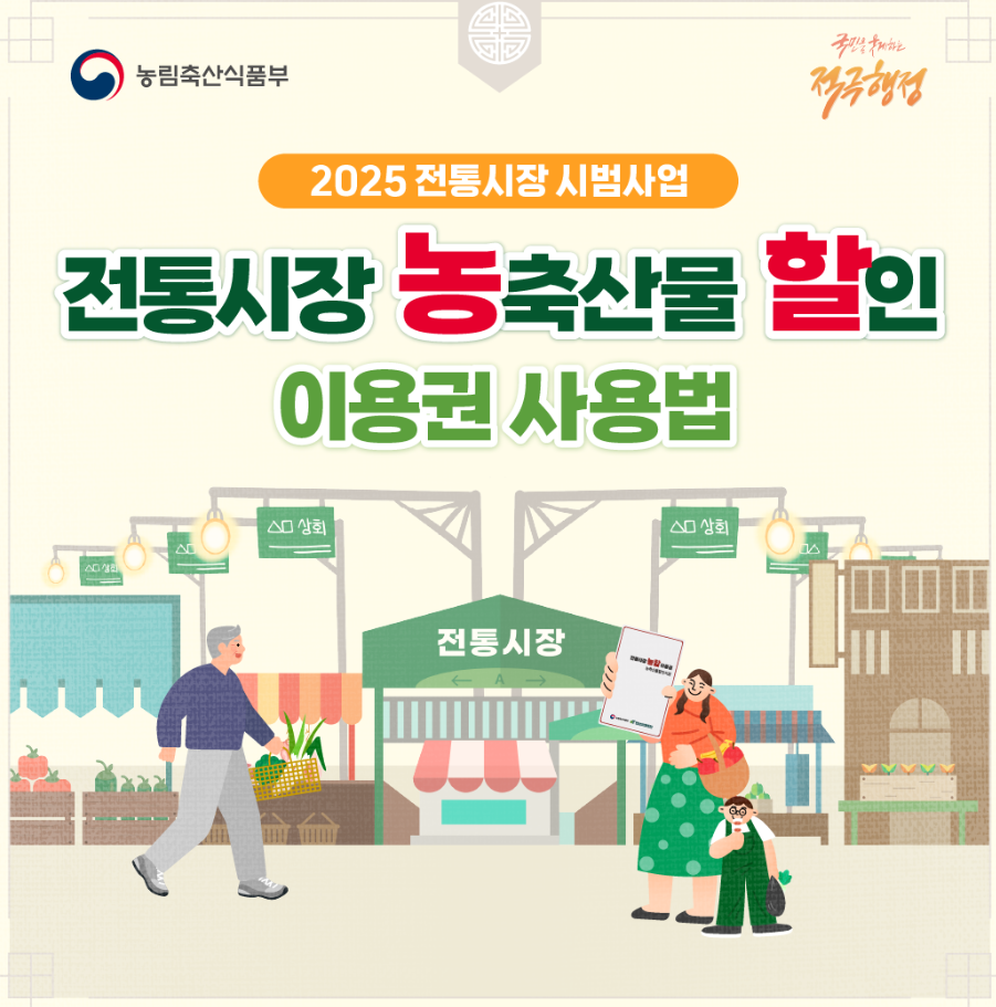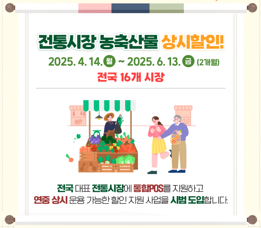 2025년 4월 14일부터 6월 13일까지 농림축산식품부는 전통시장 소비자의 물가 부담 완화를 위해 전통시장 농축산물 상시 할인 시범 사업을 실시합니다.