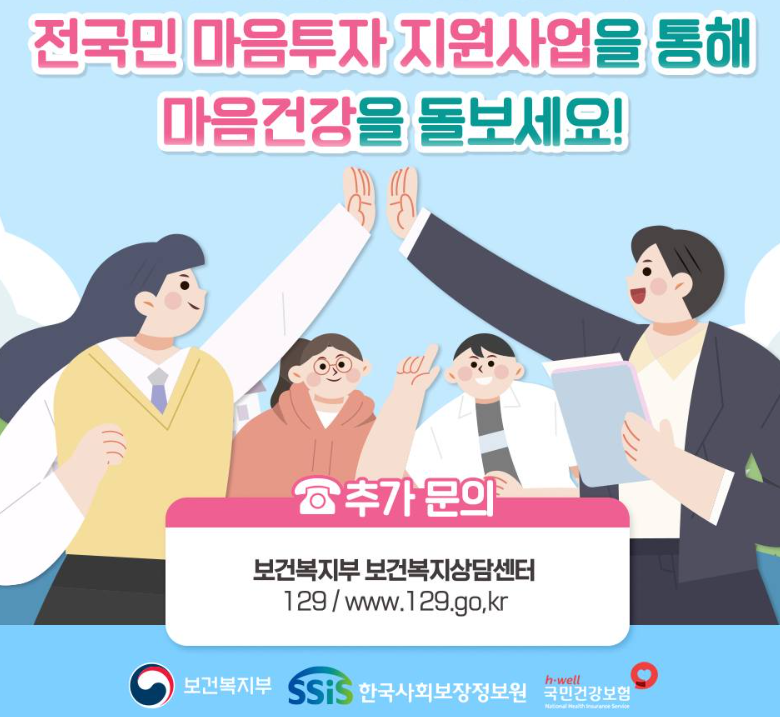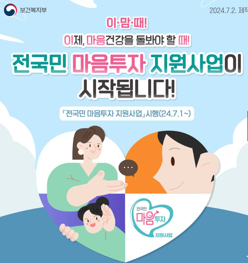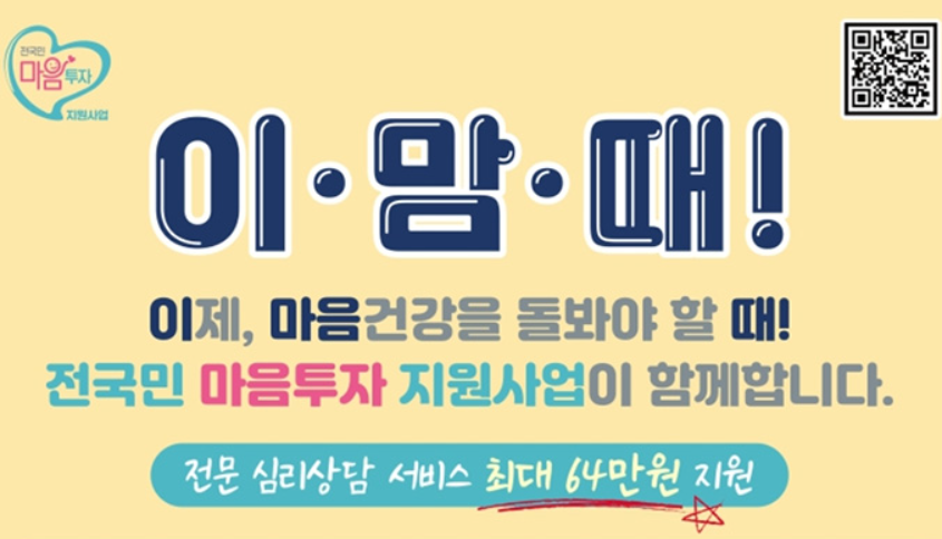우울, 불안, 스트레스, 무기력 등 다양한 정신적 어려움을 겪는 국민이 늘어남에 따라 정부는 실질적인 심리 지원 정책을 마련하고, 이에 따라 전국민 마음투자 지원사업을 시행하고 있습니다.