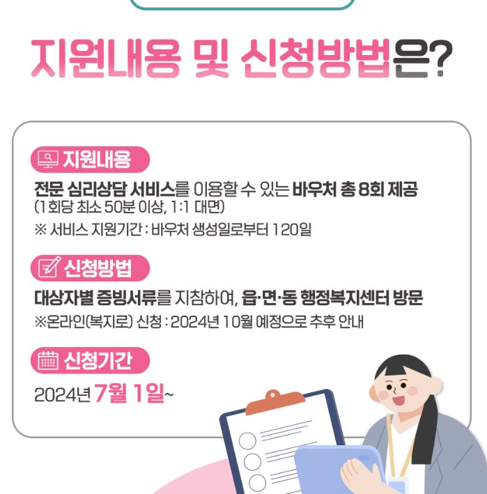 ● 절차: 상담 필요 증빙서류를 지참하여 방문 → 사회보장급여 신청서 작성 → 접수 후 바우처 생성