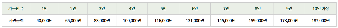 ✅ 지원 금액: 가구원 수에 따라 매월 차등 지급 (예: 1인 가구 4만 원, 2인 가구 6만 원 등)