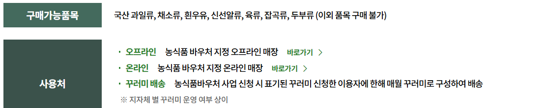 ✅ 지원 품목: 국산 채소, 과일, 흰 우유, 신선알류, 두부류, 잡곡, 육류 등