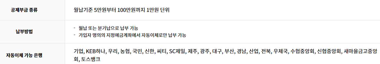 이는 직장인의 퇴직금과 비슷한 개념으로 볼 수 있으며, 가입자는 매월 일정 금액을 납입하고 필요할 때 공제금을 받을 수 있습니다.