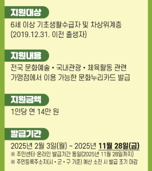 - 문화누리카드는 만 6세 이상(2019년 12월 31일 이전 출생자)으로, 기초생활수급자 및 차상위계층이라면 누구나 신청할 수 있습니다.